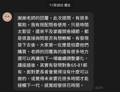近期因為底下新人接到很多場鄰里的講座,年紀都為長輩為主,